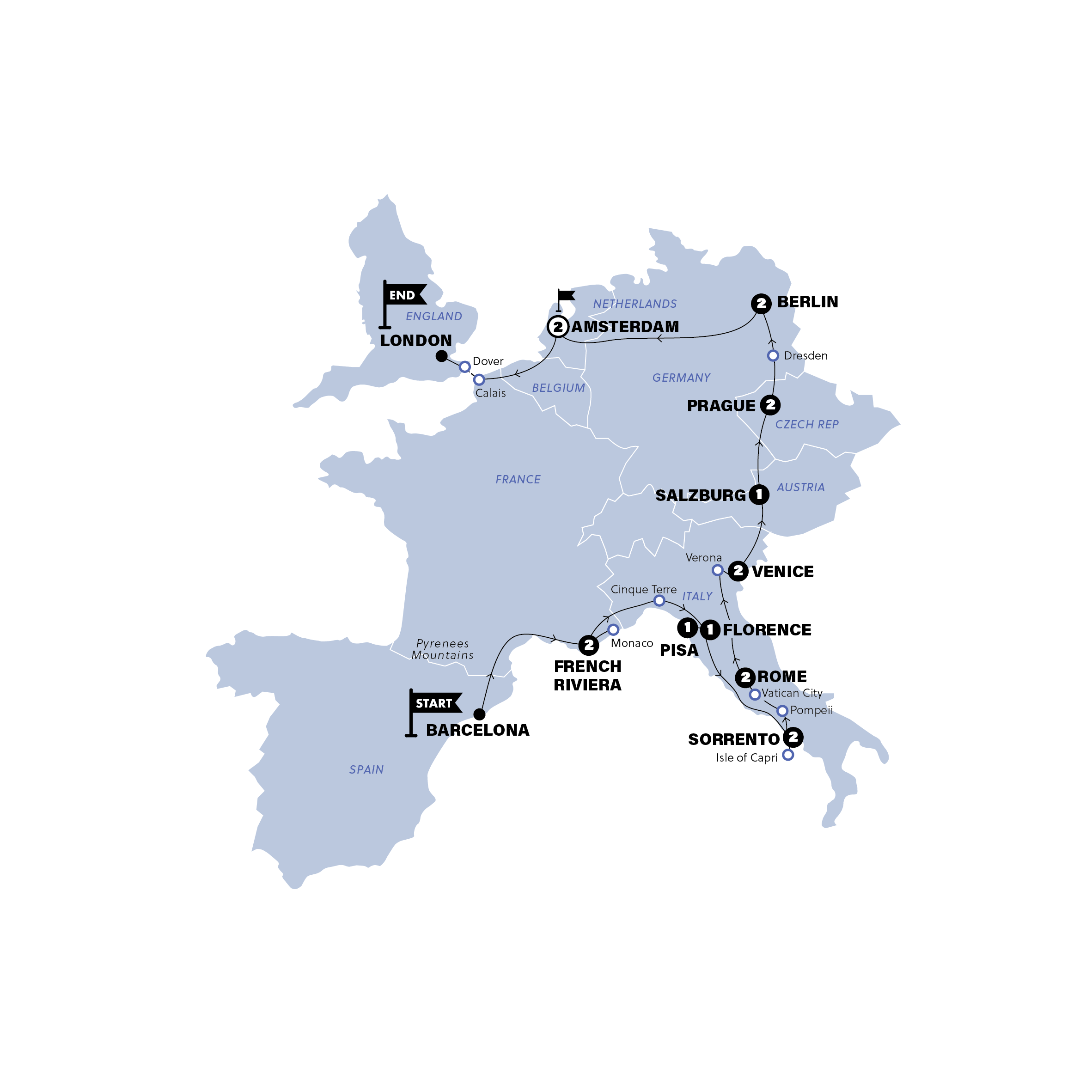 The perfect mix of seasides and cities, the Barcelona to London Quest kicks off in Barcelona, skirting the Mediterranean Sea before heading up through the middle of Italy and on to Eastern Europe, winding up in London after a perfectly balanced adventure.