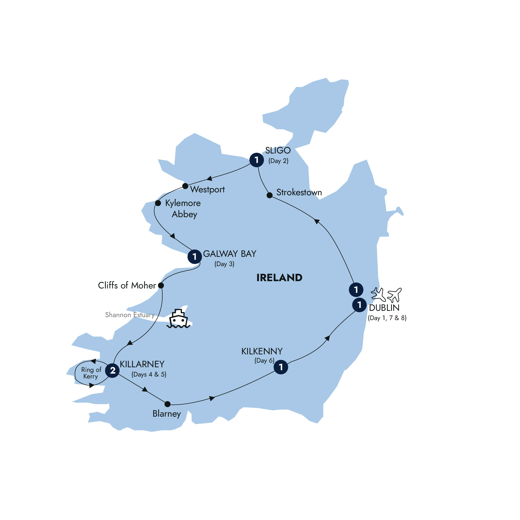 Embark on an up-close and personal encounter with Ireland's nature at the towering Cliffs of Moher. Perched at 214 m (702 ft), take in views of the Clare Coast and the pounding Atlantic. Gain insights into the cliffs’ geology and history before crossing the Shannon Estuary by ferry from Killimer to Tarbert. Head to Killarney where you’ll relive the highlights of the day over a Dine-Around evening of local cuisine. You also have your pick of Optional Experiences including a Celtic Steps performance or a Gaelic Roots show of song and dance.