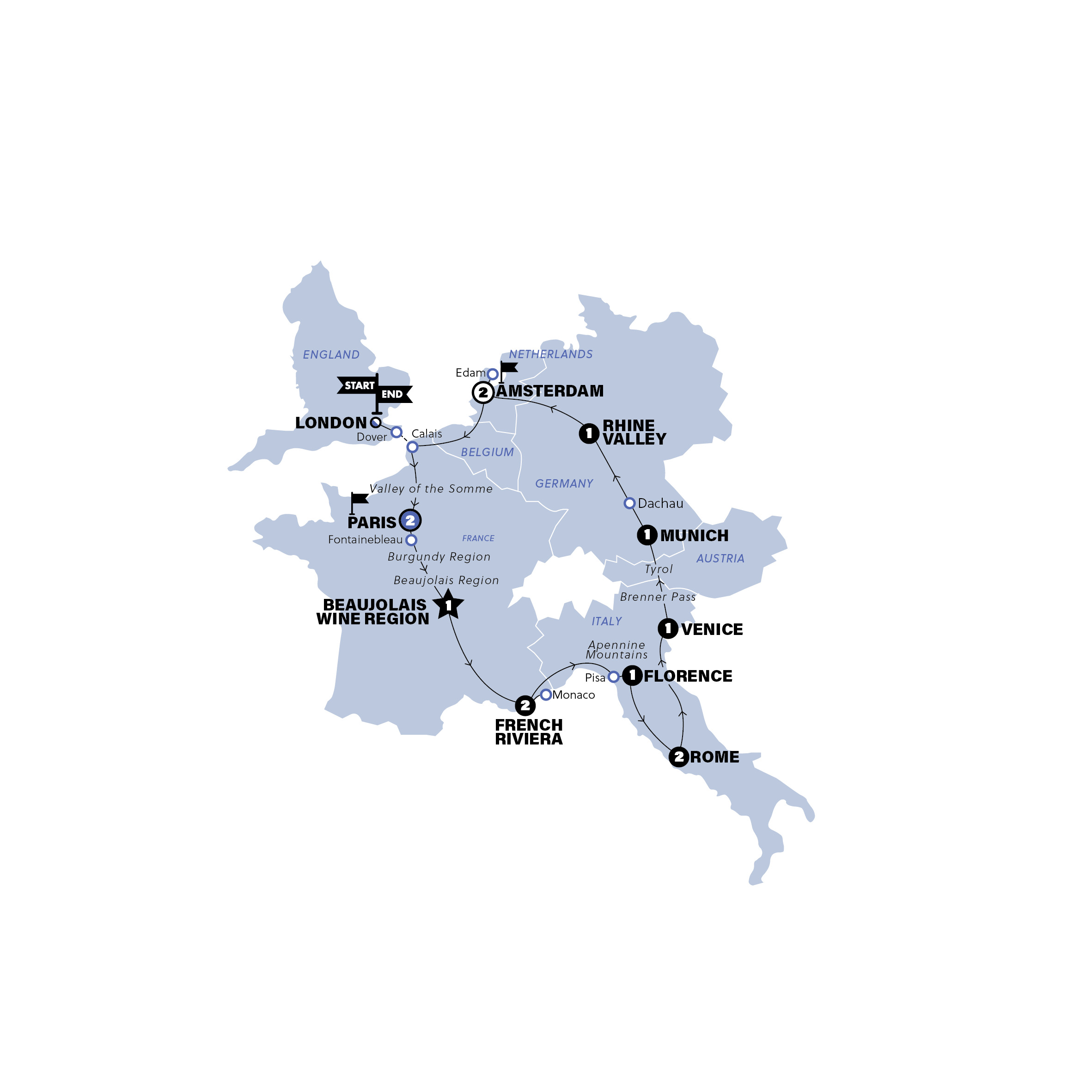 Down your breakfast and wipe away your tears - this is always the worst day of the trip. We'll escort you to Schiphol Airport by about 10am for those leaving us in the canal lined city. For those not leaving us until London, we'll travel south through Belgium, then cross into France to Calais. We'll make our way back to London-town, where you'll be left to start dreaming up your next big adventure. This concludes your 14-day trip to Europe. What a journey! Say a fond farewell to the group as you wrap up the trip on arrival in London.
