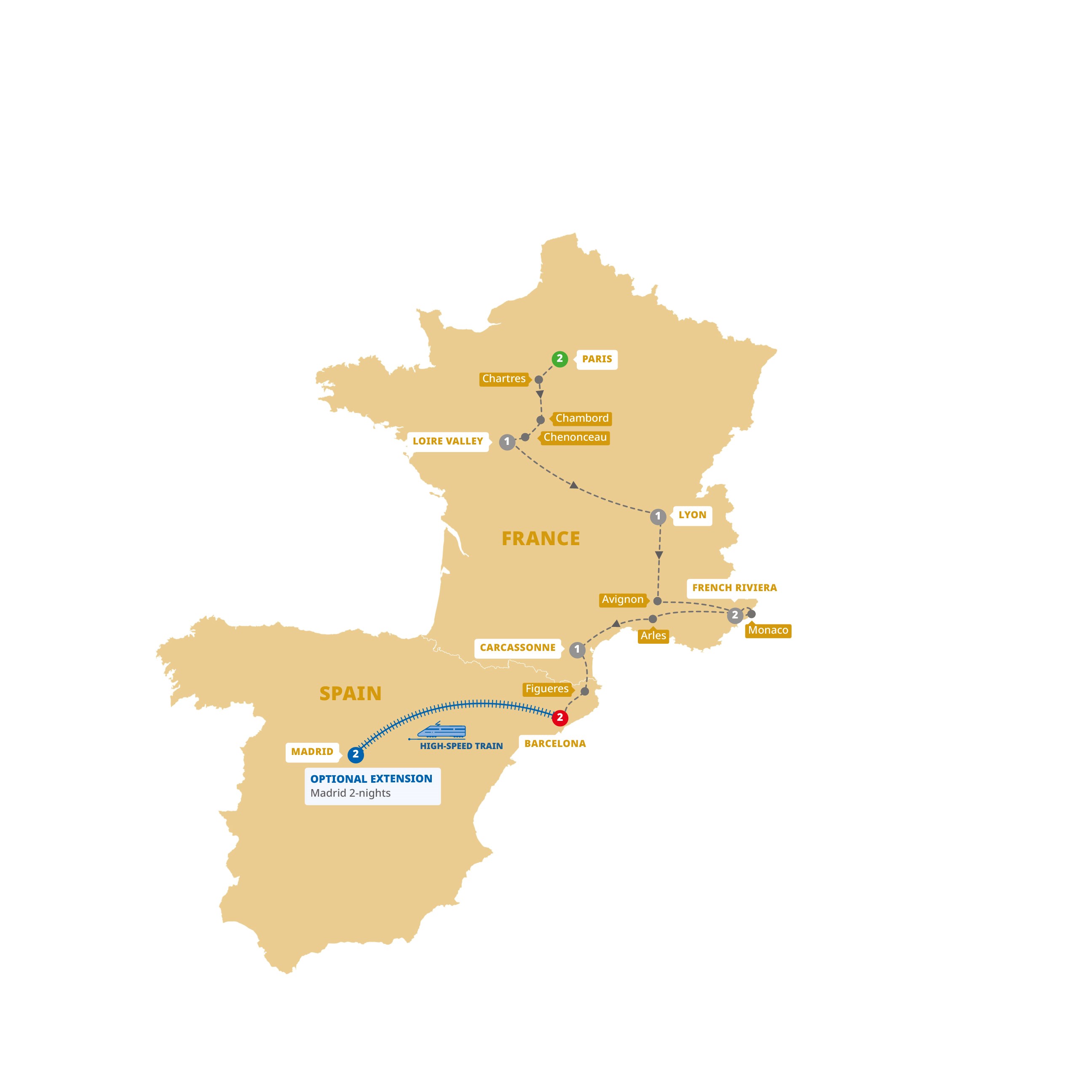 One of our most popular France and Spain trips, this jam-packed journey from Paris to Barcelona is a feast for every sense, from lunch with locals and elegant chateaux in the Loire Valley, to the buzz of Avignon’s Place de l’Horloge and the irresistible French Riviera.