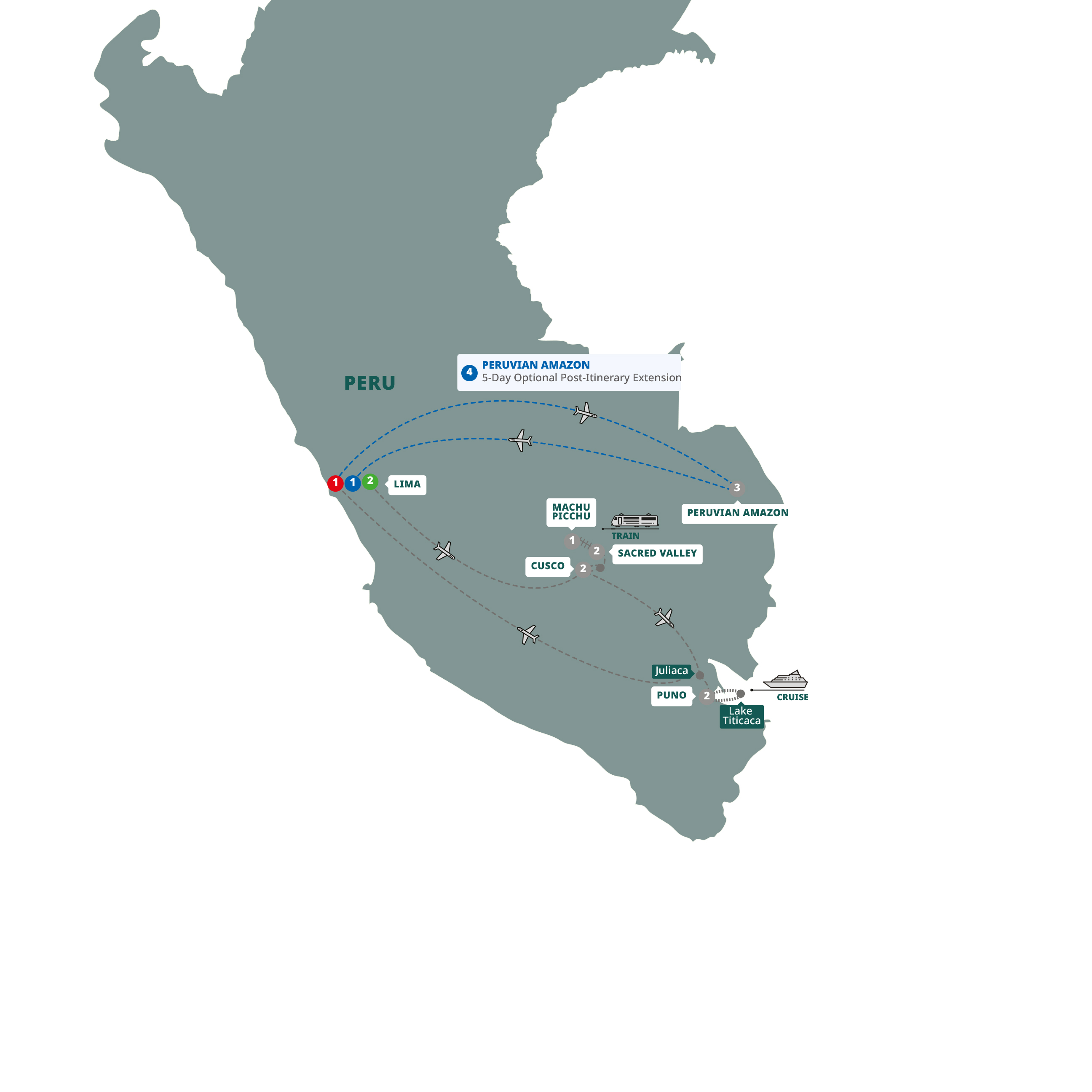 - A Trafalgar bonus all Intra-Air Flights: Lima to Cusco, Cusco to Juliaca and Juliaca to Lima, including porter service at all airports.