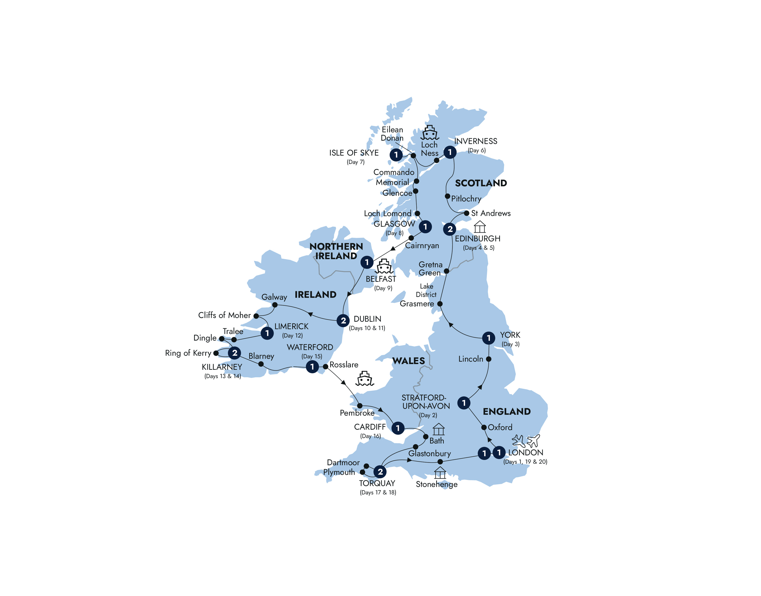 Fast paced tour that covers much of the significant sites in England and Ireland.