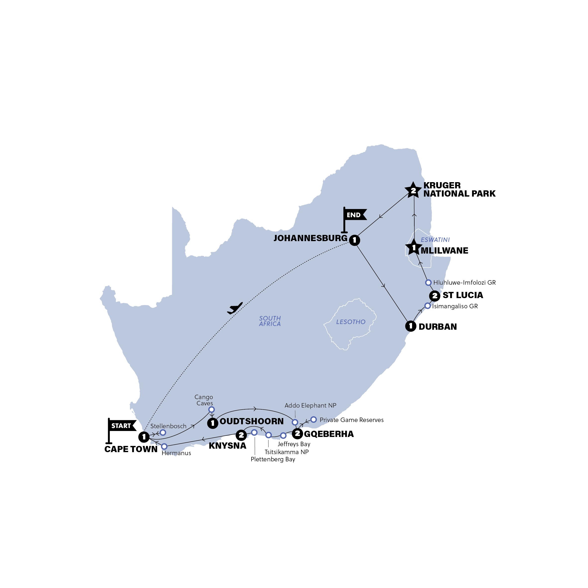 Our final day. But is there time for one (or two) last morning game drives? You bet there is. You can choose to head out for a sunrise game drive to spot the nocturnal cats (or just choose to sleep in, like the rest of the animals). Then, we'll head out on our last game drive in Kruger as we make our way out of the park. It's our last chance to spot some spellbinding safari animals IRL. Have we saved the best for last? Let's hope so! And now, with heavy hearts (and even heavier camera rolls) we’ll make our way back to either the Kruger Mpumalanga Airport or Johannesburg International Airport. (Don't feel like leaving yet? Lucky for you, our Victoria Falls Explorer & Cape Town Explorer trips are starting later this evening!). Oh, it’s been a thrill… we’ve seen wildlife, we’ve made friends for life. The only question is: where next?