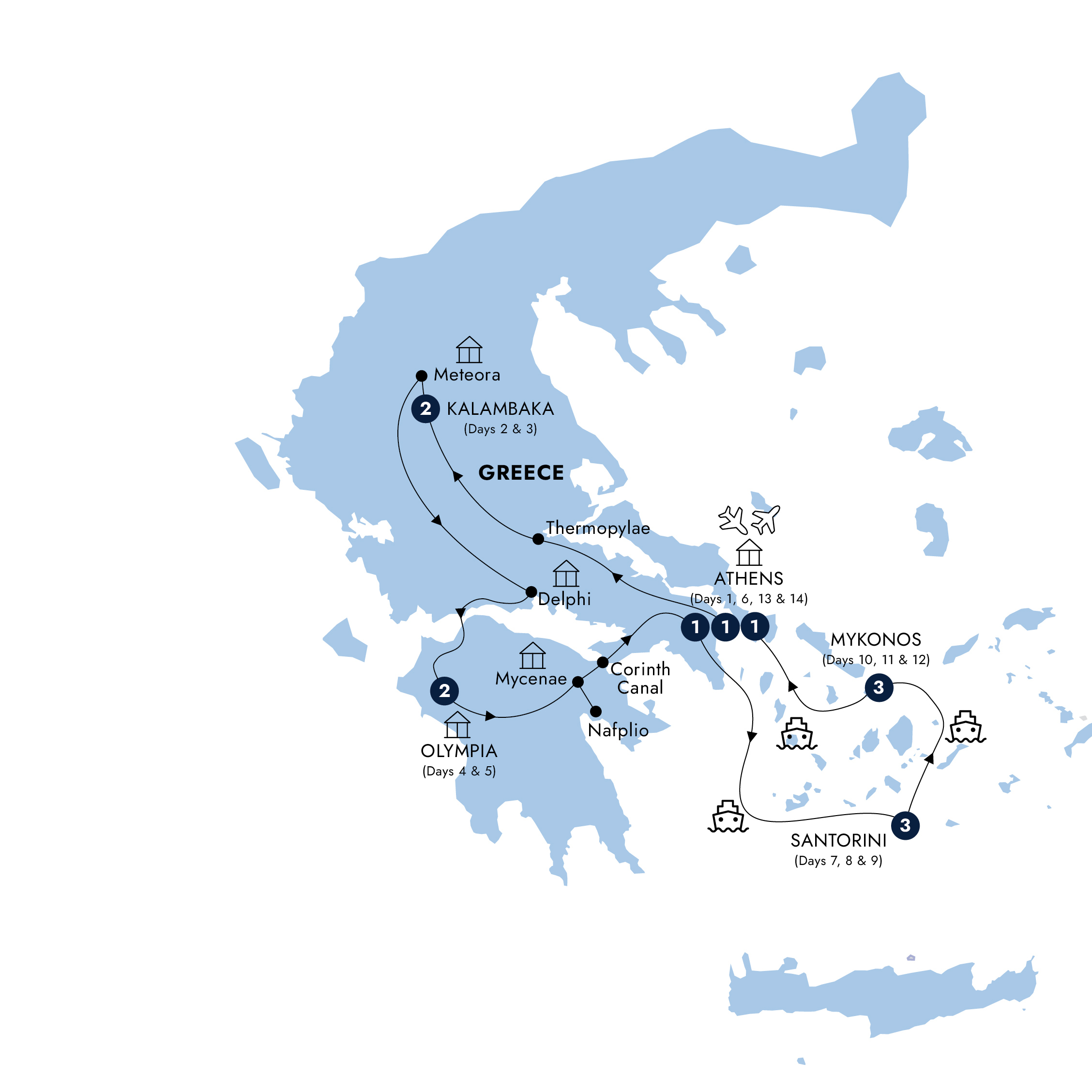 Our travel director was amazing. He shared so much information about the history and culture, plus added personal stories about himself and his family. He was well organized, kept us all on track, and was great at keeping everyone safe and calm. The hotel accommodations were wonderful and each hotel was unique. The coach bus was comfortable and the drivers were superheroes navigating the traffic, mountains, cliffs, city streets, etc. The length of the trip was just right (14 days). It was nice doing the busier portion of Athens, Kalambaka, Olympia the first week and the slower pace of the islands the second week. I really enjoyed Day 5 Ancient Olympia with a visit to the Olympic museum and stadium followed by a farm-to-table experience at a local olive farm. Several optional experiences that were well worth it include Lively Trikala Town and Dinner (wine and dancing!), Santorini Island Tour with Visit to Akrotiri (the preserved city referred to as Prehistoric Pompei was amazing), and Mykonos Island Tour (swimming in the beautiful blue-flag awarded Aegean Sea was awesome).